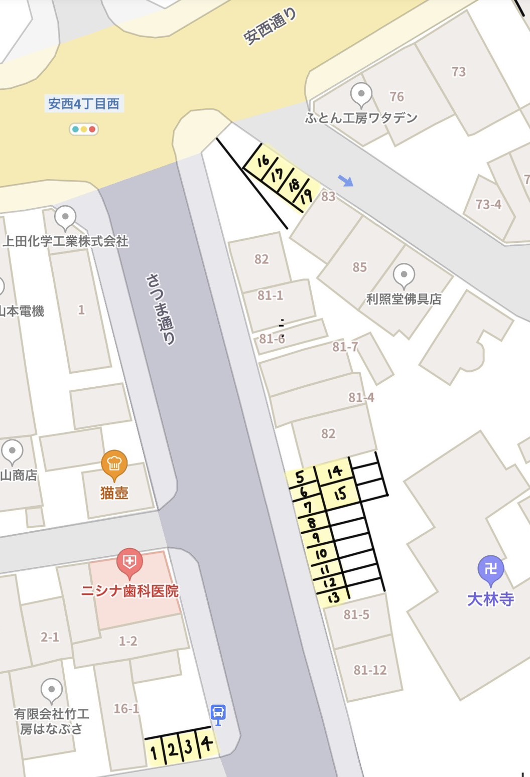 •安西四丁目交差点の看板がある三角形の駐車場(4台) 図の16-19